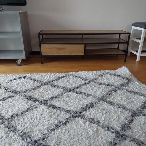 Tv-bänk på hjul i grått med en vit dörr. Möbeln har öppna hyllplan på ena sidan och ett skåp med dörr på den andra sidan, vilket ger utrymme för tv, mediautrustning och förvaring av tillbehör. Bänken står på hjul som underlättar förflyttning och ommöblering. Passar som tv-möbel eller mediabänk i vardagsrum eller sovrum.
