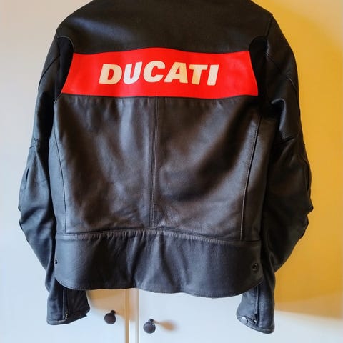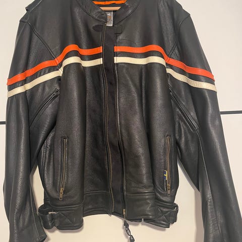 Sevenoaks skinnjacka i beige med blå och röda detaljer i storlek M. Jackan har flera tryck och märken, bland annat siffran 69 på fram- och baksida samt ärmar. Modellen har ståkrage, dragkedja framtill och två framfickor med dragkedja. Baksidan är delvis svart. Passar som motorcykelinspirerad eller retroinspirerad jacka.
