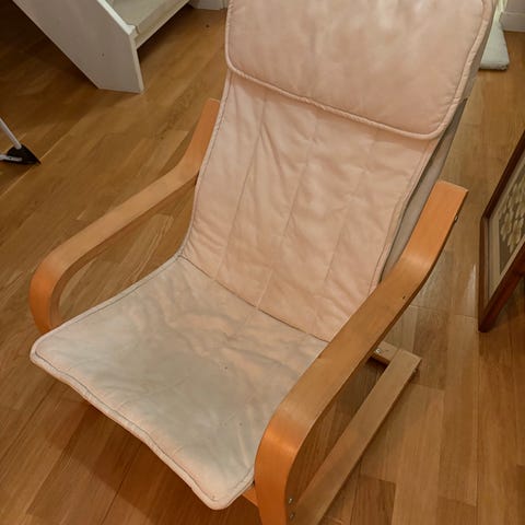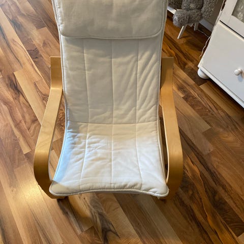 Fåtöljen är hel. Sitsen har någon obehandlat fläck. Går att tvätta tyget lätt i maskinen.