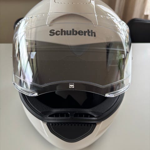 Schuberth C4 Pro MC-hjälm i storlek XL (61 cm). Hjälmen är svart med grafiskt mönster. Vikt enligt märkning är 1850 g ± 50 g. Visir med stort synfält och integrerad solskärm. Levereras med originalförpackning, hjälmpåse, manualer samt tillbehör som laddkabel och Schuberth-kommunikationsenhet med batteri (SC1 Standard enligt förpackning). Lämplig för motorcykelkörning på landsväg och pendling.