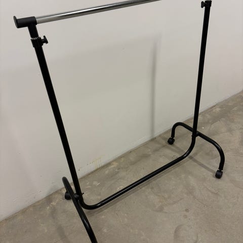 IKEA klädställning i svart metall. Fristående modell med A-formade ben och överliggare för upphängning av kläder på galgar. Passar för hall, sovrum eller klädkammare som extra förvaringslösning för jackor, skjortor och andra plagg. Stabil konstruktion som står direkt på golvet.