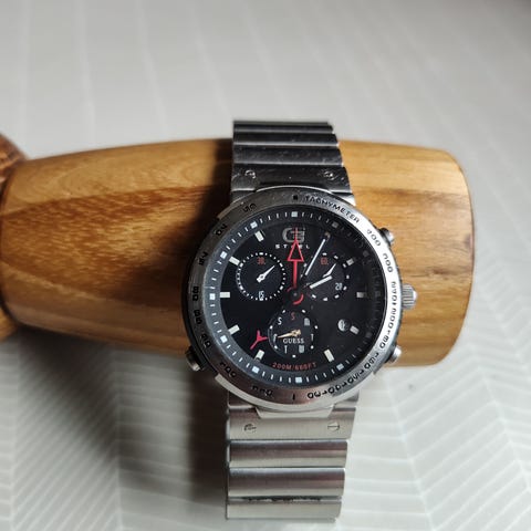Guess armbandsur med rektangulär boett och analog urtavla. Uret har två separata tidsvisningar på en ljus urtavla med tydliga siffror. Klockan har brunt läderarmband med struktur och klassiskt spänne. Passar som vardags- eller dressklocka.