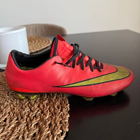 Nike Mercurial Vapor fotbollsskor för junior i röd färg. Lågskaftad modell med snörning och dobbar anpassade för spel på gräsplan. Ovandel i syntetmaterial med texturerad yta för bättre bollkontroll. Sulkonstruktion framtagen för att ge grepp och stabilitet vid riktningsförändringar på planen. Storlek enligt märkning på insidan av skon (se bild för detaljer). Retro skor också svåra att få tag på