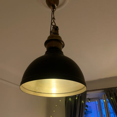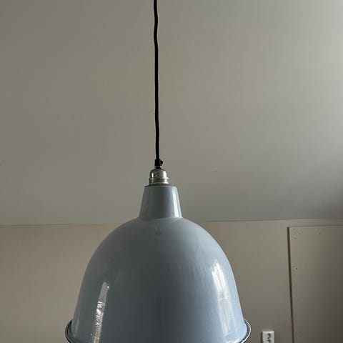 En nästintill oanvänd taklampa i trä och metall. Lampan har en klassisk form med ljusbeige skärm och detalj i trä. Kedjorna ger lampan lite industriellt utseende. Dansk design. Kan ev skickas också.