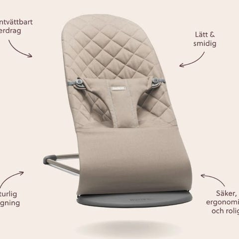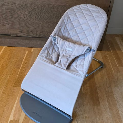 BabyBjörn babysitter med tillhörande ställning och två textilöverdrag i olika färger, ett grått och ett blått. Överdragen är vadderade och anpassade för babysittern, med sele för att hålla barnet på plats. Babysittern har metallställning med justerbar lutning och fotdel i plast. Produkten är avsedd för spädbarn och småbarn och kan användas som sitt- och viloplats i hemmet.