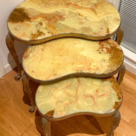 Satsbord i nästlad modell med tre rektangulära bord i olika storlekar. Borden är bruna och har släta, raka linjer med modern design. Mindre bord kan skjutas in under det större för att spara plats. Passar som soffbord, sidobord eller extra avlastningsytor i vardagsrum, hall eller sovrum.