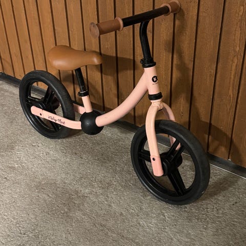 Barncykel 12" i vit och rosa färg med stödhjul. Cykeln har låg ram som underlättar på- och avstigning för mindre barn. Utrustad med fotbroms bak och handbroms fram samt kedjeskydd. Passar som första cykel för barn som ska lära sig cykla på två hjul med stöd av stödhjul.