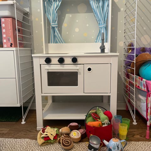 IKEA leksakskök med högvis av tillbehör. Köket har spishäll (lamporna funkar), diskho med blandare samt förvaringsutrymmen med hyllor och skåpsdörrar. Till köket följer en massa olika köks- och matleksaker, bland annat kastruller, stekpannor, skålar, tallrikar, bestick, köksredskap, leksakskassaapparat, leksakskaffemaskin samt olika leksakslivsmedel i plast och tyg. Passar för rollekar i hemmiljö eller lekrum där barn kan leka matlagning, servering och affär.