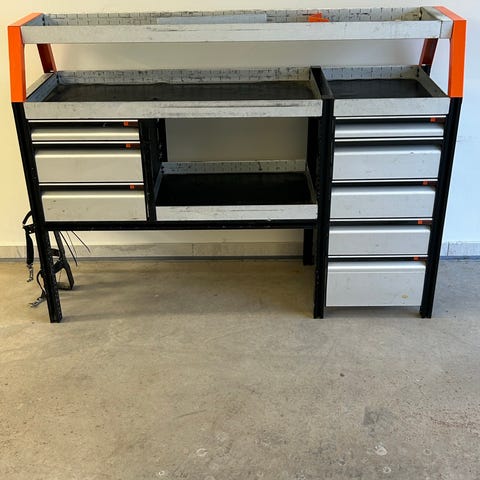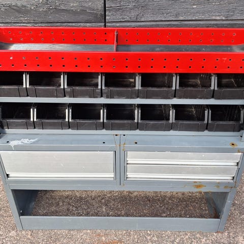 LJ Bil & Bussinrednings hyllsystem och lådmoduler i grå och grön färg. Inredningen består av flera hyllsektioner med perforerade sidopaneler för upphängning av verktyg och tillbehör, samt lådmoduler med utdragslådor för förvaring av mindre delar. Utdragbart skruvstäd. Passar montering i skåpbil eller transportbil, har suttit i en VW Crafter