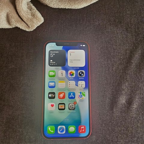 Apple iPhone 12 med 64 GB lagringsutrymme. 78% batterikapacitet. Sitter skärmskydd på som har en spricka, levereras med skal, hörlurar och laddningskabel.