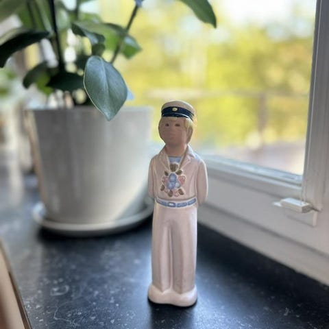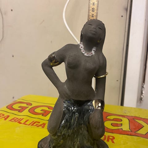 Jie Gantofta figur i keramik föreställande en stående kvinna med armarna i kors och hatt med blommor vid sidan. Figuren är huvudsakligen vit med gröna och rosa detaljer samt mönstrad nedre kant i grönt. Höjden framgår av måttstocken på bilden (ungefärlig höjd runt 30 cm). Passar som prydnad i hylla, på byrå eller fönsterbräda.
