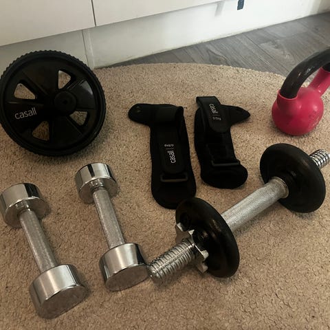 Kayoba hantelset 19 kg med lösa vikter. Setet består av två hantelstänger med tillhörande viktplattor som kan kombineras för att justera den totala vikten upp till 19 kg. Hantlarna är avsedda för styrketräning i hemmet och kan användas för övningar för armar, axlar, bröst och rygg. I bilderna syns även push up-handtag som kan användas som stöd vid armhävningar och annan kroppsviktsträning.