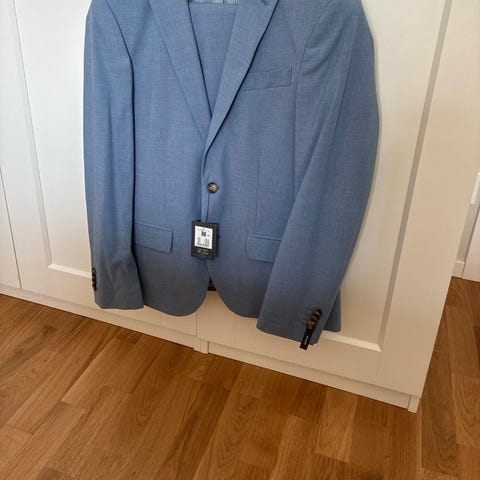 Dressmann Wool Stretch kostym för herr. Kavaj i storlek 48 och byxor 36-30. Kostymen är blå och tillverkad i polyester, ull samt elastane lycra. Setet består av kavaj med slag, framfickor och innerfickor samt matchande kostymbyxor med pressveck och hällor för bälte. Kostym är använd vid ett tillfälle under 2 timmar. Är i mycket fint skick.