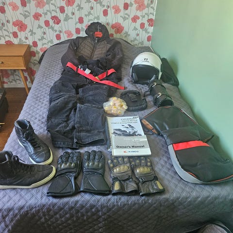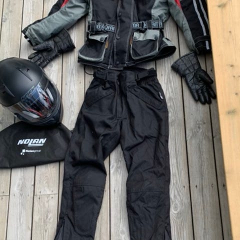 Skickas ej. Stövlar 45. Hjälm large. Stor jacka 60. 2 jacka st xxl. Handskar 12. Byxor xxl.