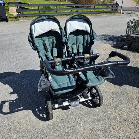 Säljer vår smidiga och stabila dubbelvagn Emmaljunga Double Viking. Vagnen är lättkörd även med två barn.