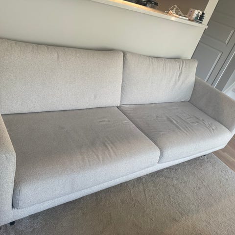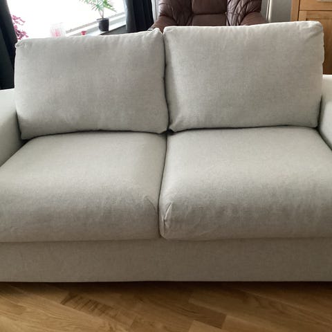 Soffa i 2-sitsmodell i beige tyg. Soffan har raka linjer med två sittdynor och två ryggdynor samt markerade armstöd. Benen är smala och mörka, vilket ger ett lätt intryck mot golvet. Passar som sittmöbel i vardagsrum, gästrum eller mindre utrymmen där man önskar en kompakt soffa med två sittplatser.