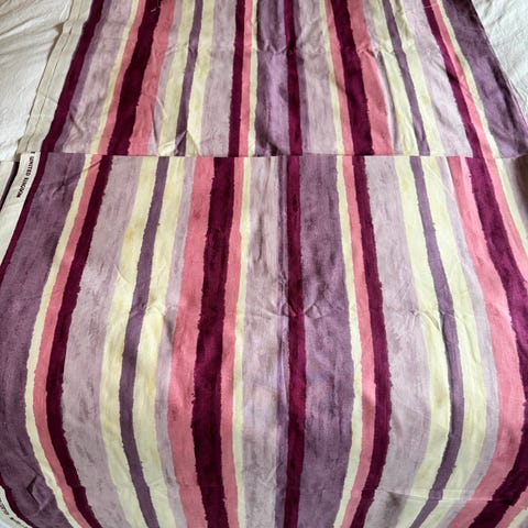 Tyg/stuvbit i bomull. Prestigious design . Lila grundfärg med tryckta motiv av blommor, hjärtan och stjärnor i flera färger. Tryckt i Storbritannien. Bredd 141 (+ 2 cm stadkant på vardera sida). Längd 600 cm.
