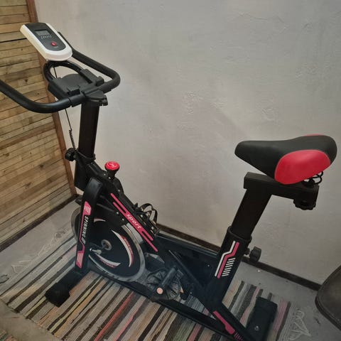 Pulse spin cykel i blå färg. Motionscykel med justerbart styre och sadel för anpassning till olika användare. Utrustad med svänghjul fram och pedaler med remmar för stabil trampning. Passar för inomhusträning och konditionspass hemma eller på mindre gym.