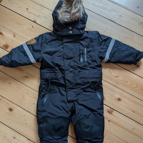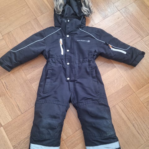 Didriksons overall för barn i storlek 80, avsedd för pojke. Overallen är svart och tillverkad i polyester. Den har huva med pälskant, förstärkta partier på knän och bak samt reflexdetaljer på ben och ärmar. Materialet är märkt som 100 % vattentätt. Lämplig som ytterplagg under kallare och blötare väderförhållanden.