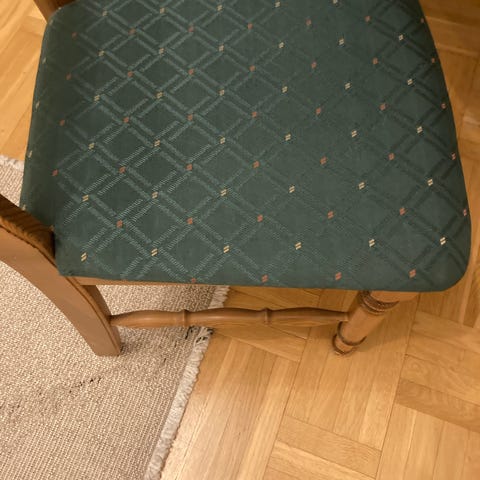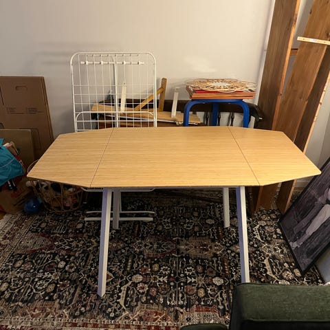 Hög matbord inbyggd iläggsskiva + 8 tillhörande stolar. Bordskivan behöver lite omvårdnad då det finns en del märken. Annars är både bordet och stolarna stabila.