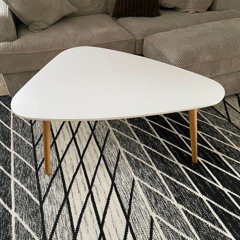 Plektrumformat soffbord i ljus ask. Modell Anne från Mio. I mycket fint skick och har enbart använts till ett par homestylinguppdrag. En möbeltass saknas.
