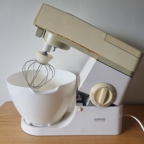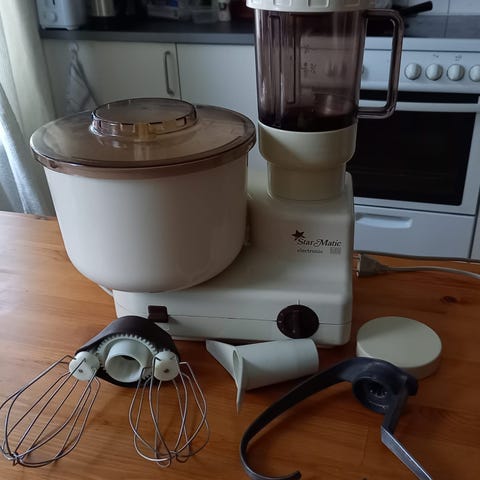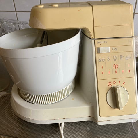 Philips köksmaskin i beige färg. Maskinen har blandarskål och överdel för matberedning. Reglage på sidan med flera hastighetslägen och symboler för olika funktioner, till exempel blandning och vispning. Passar för enklare mat- och bakförberedelser i hemmet.