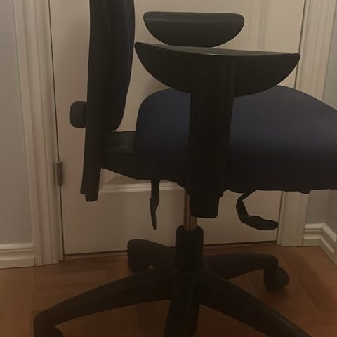 Blå kontorsstol, fungerar bra bortsett från ett hål i klädseln där stoppningen har börjat ramla ut. Justerbart ryggstöd och armstöd.