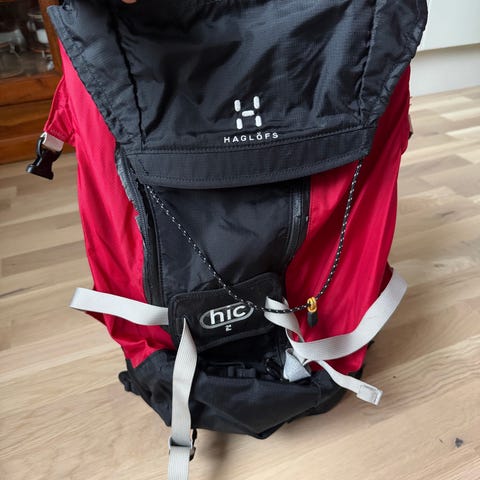 Utsida med sidofickor i mesh/tyg och fästmöjligheter framtill med rem och medföljande karbinhake. Justerbara axelremmar och bärhandtag upptill. Passar för vardagsbruk, utflykter och enklare friluftsaktiviteter.