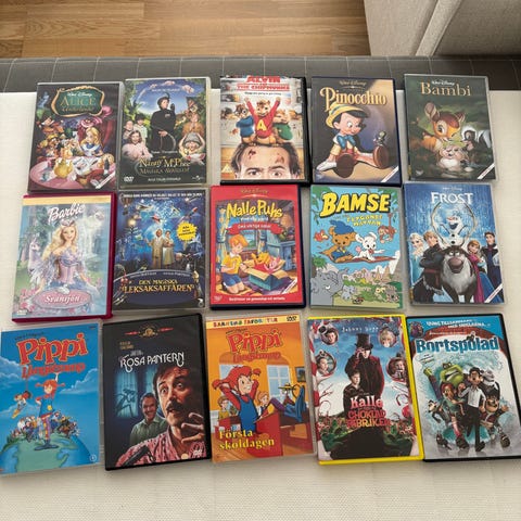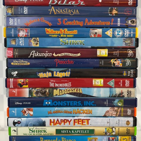 Blandade barnfilmer DVD samling. Flera olika titlar och serier för barn, bland annat tecknade filmer och familjefilmer. Skivorna är i standard DVD-format och förvaras i sina originalfodral. Passar för uppspelning i DVD-spelare som stödjer region för svenska utgåvor. Samlingen kan innehålla både enstaka filmer och avsnittssamlingar från olika barnprogram.