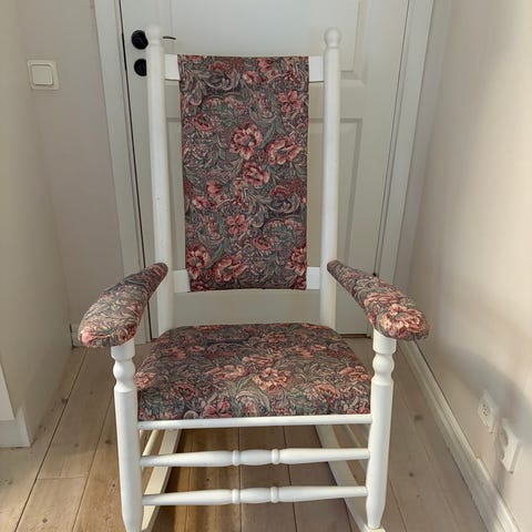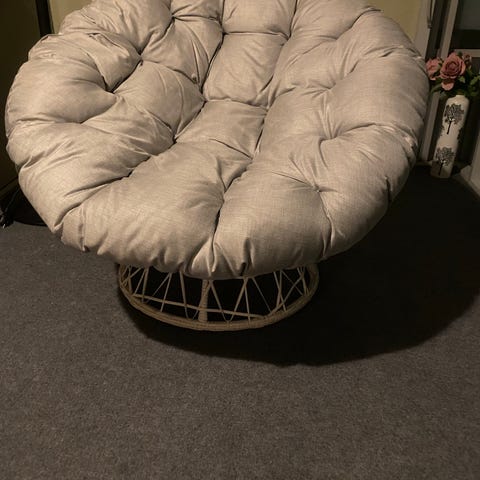 Fin vit hängstol med mörkgrå dyna på ställning.