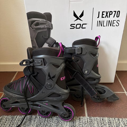 SOC ADJ70 inlines för barn i storlek 35- 38. Justerbar. Färgkombination i svart med blå detaljer och hjul i gröna och blå nyanser. Modellen har hårt yttre skal med justerbar passform, snörning, spänne och kardborreband för att hålla foten på plats. Fyra hjul per skridsko med broms bak på ena skridskon. Lämpliga för rullskridskoåkning och inlinesåkning utomhus för barn i angiven storlek.