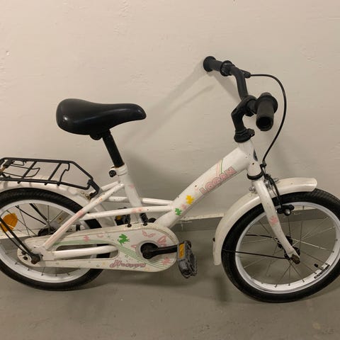 Barncykel med 16" hjul. Cykeln har lila ram med vit framgaffel, raka styre och svart sadel. Utrustad med fotbroms bak och handbroms fram samt reflexer i hjul. Passar barn som är redo för cykel i 16-tumsstorlek. Finns i Solna.