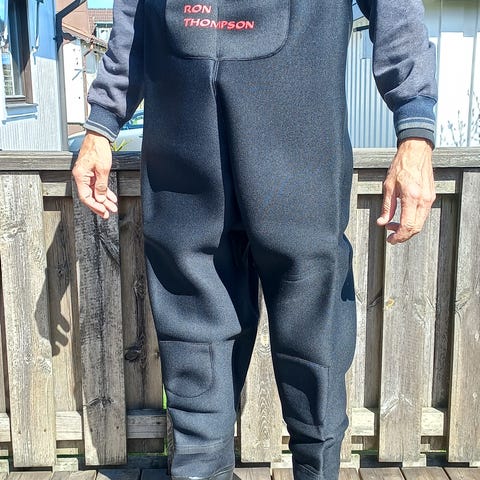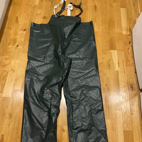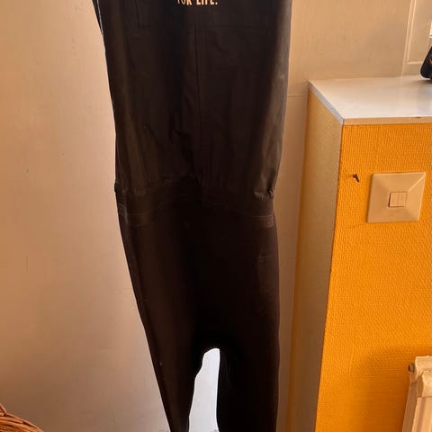 Vattentäta neopren byxor sammanfästa med stadiga, grovmönstrade stövlar i storlek 45. Bekväma hängslen. Rymlig vattentät ficka i brösthöjd. Använda ett fåtal gånger.
