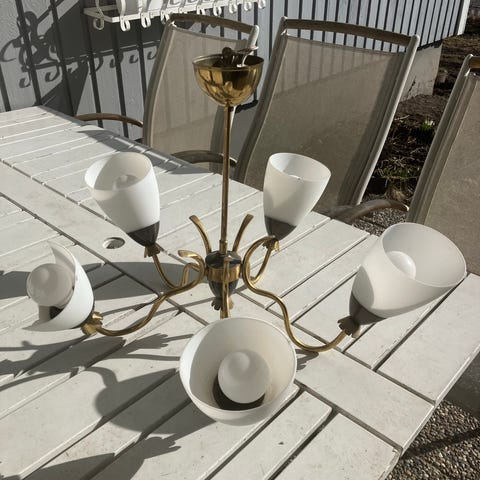 Dekorativ, välfungerande 5-armad Asea taklampa som i helhet är i gott skick. Helrenoverad el: Nya elledningar, lampsocklar(E27) och kontakt.