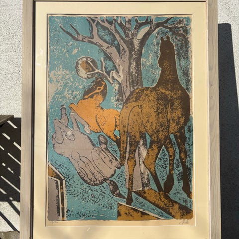 Kvadratisk tavla med konsttryck föreställande ett hästmotiv i dämpade, sepia-liknande toner. Verket är inramat med en silverram. Baksidan visar upphängning och handskriven text, vilket är signatur och anteckningar från konstnären. Tavlan mäter 60x60 cm.