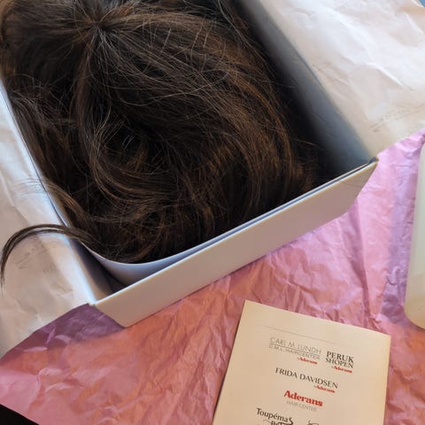 Medicinsk kvalitetsperuk i 100 % modacrylic fiber (syntethår av hög kvalitet).