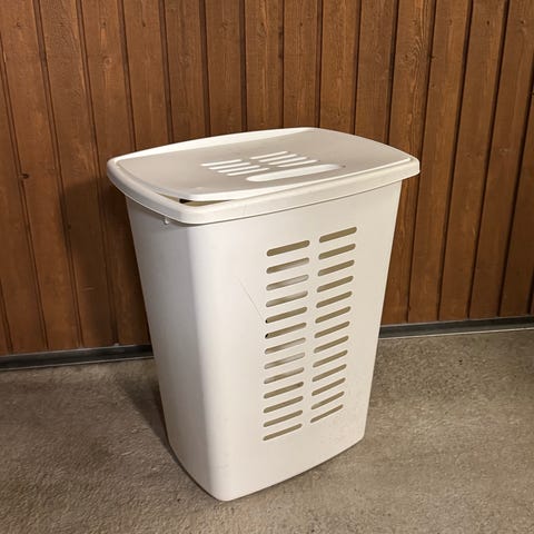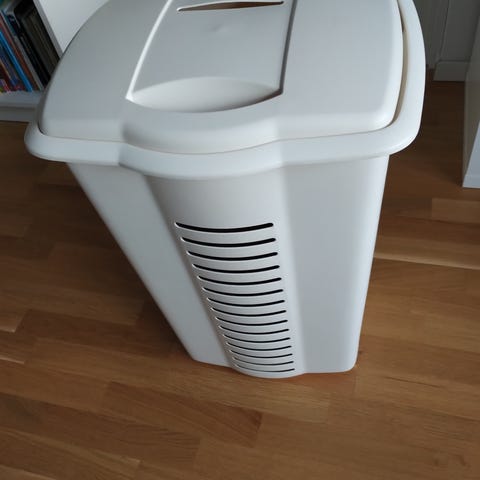 Vit papperskorg med lock i plast. Rektangulär form med avtagbart lock som underlättar tömning och rengöring. Passar för användning i hem, kontor eller andra inomhusmiljöer där en enkel och neutral avfallsbehållare önskas.
