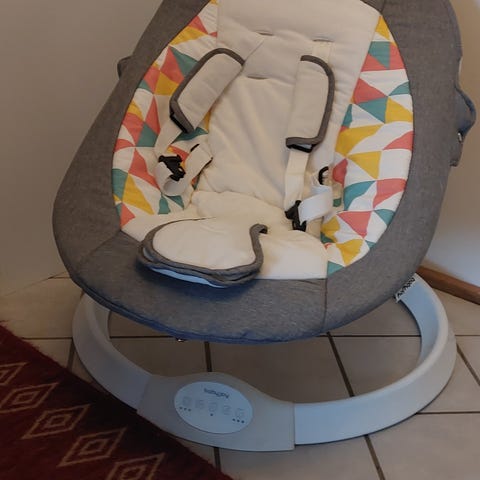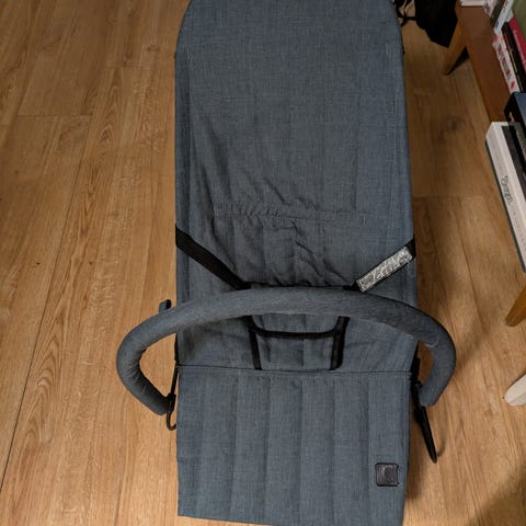 Babysitter i svart tyg med metallstativ.