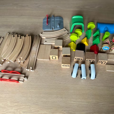 BRIO trätåg och tågbana med flera delar.