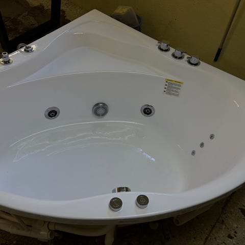 Hörnbubbelbadkar i vitt utförande. Badkaret är utformat för placering i hörn och har flera munstycken för vatten- eller luftmassage. Det är utrustat med två nackkuddar och integrerade blandare/reglage på kanten. Passar för installation i badrum där man önskar ett hörnplacerat bubbelbadkar med massagefunktioner.