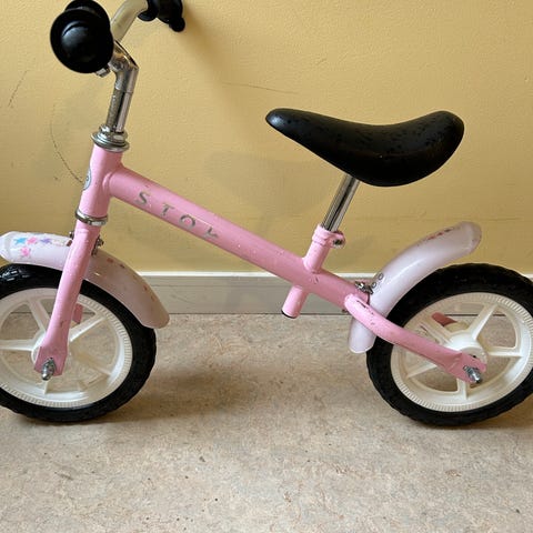 Spring cykel STOY med 12" hjul i rosa färg. Cykeln har vit plastfälg, svarta däck och svart sadel. Utrustad med stänkskärm bak och ringklocka på styret. Passar mindre barn som ska träna balans och cykling på en enkel cykel utan pedaler.