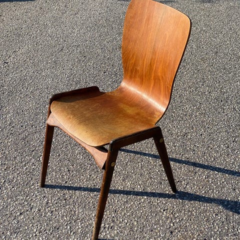 Stolarna har en mycket karaktäristisk design med en elegant, organiskt formad rygg i vackert ådrad, formpressad plywood och ett stilrent underrede i svartlackerad metall. Sitsen är klädd/laminerad i svart. Fint begagnat skick med naturligt slitage och mindre fanérskador.