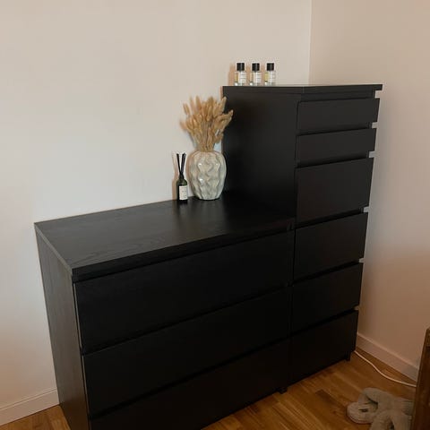 Hylla från IKEA m ”smyckeskrin” o hylla högst upp.