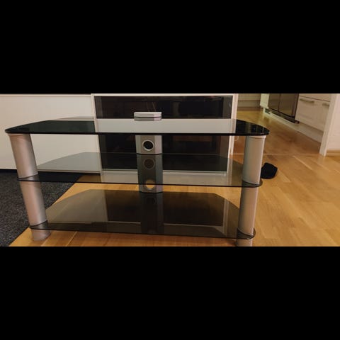Säljer en stilren vintage TV-bänk med tre hyllplan i svart glas och kromade metallben. Perfekt för TV, spelkonsoler eller annan mediautrustning.