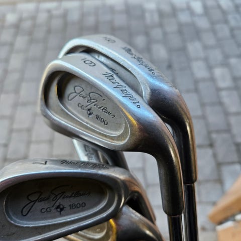 Golfklubbor set bestående av flera klubbor, inklusive järnklubbor och wedgar. Klubborna har metallskaft och svarta grepp. Lämpliga för golfspelare som söker ett komplett set för träning eller spel på bana.