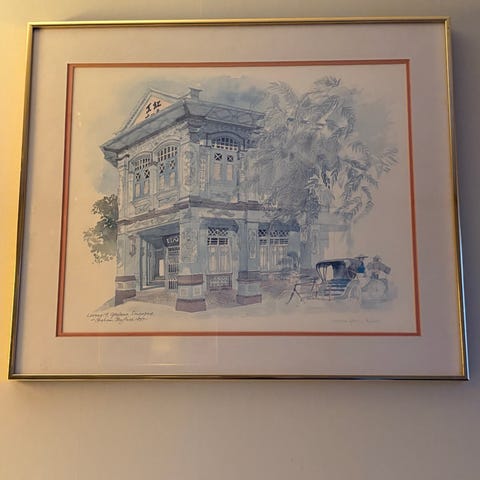 Tavla med akvarellmotiv som föreställer ett hörnhus med café i stadsmiljö. Bilden visar en byggnad med pelargång, markiser och omgivande träd. Verket är inramat med passepartout och tunn metallram. Passar som väggdekoration i vardagsrum, hall eller kontor. Litografi utav Graham Byfield från 1988 , nr 159/500.