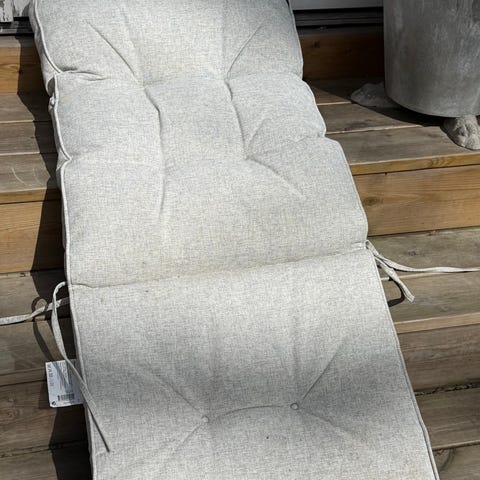 Stolsdyna i grått tyg anpassad för utomhusbruk, exempelvis till uteplats eller balkong. Dynan är vadderad och har quiltade rutor för att hålla stoppningen på plats. Den är utformad för en hög rygg och sits i ett stycke och har band för att kunna fästas vid stolen. Passar till många typer av utestolar där en längre dyna behövs för både rygg och sittdel.