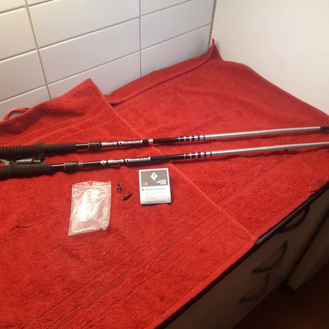 Teleskopiska gångstavar i röd aluminium. Justerbar längd markerad mellan cirka 115–135 cm. Foten går att ta bort om man vill använda spetsar istället
