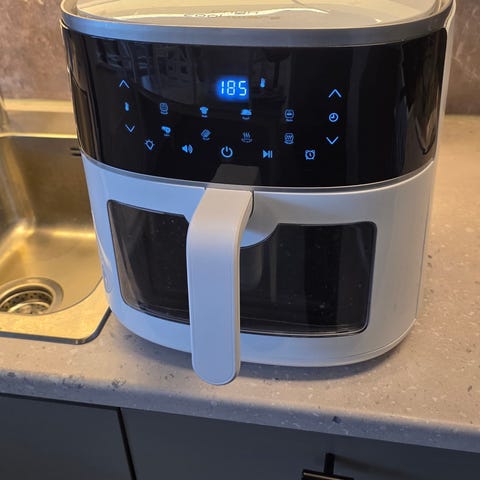 Hamilton Beach airfryer ugn i svart utförande. Modellen är en fristående varmluftsugn med frontlucka och insida i metall. Tillbehör som roterande korg/trumma och gallerplåt medföljer enligt bild.