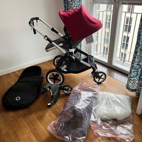 Bugaboo barnvagn vinröd med sittdel liggdel och tillbehör
